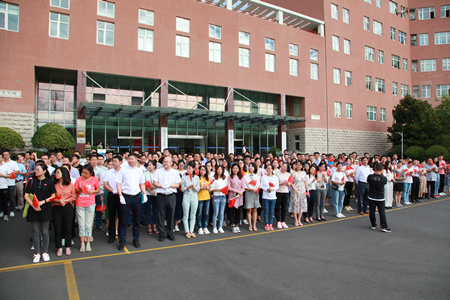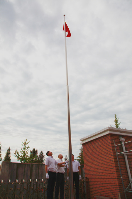 上午八點半,升旗儀式正式開始,升旗手邁著整齊有力的步伐,護送著國旗步入升旗儀式現場。伴隨著雄壯的國歌聲,五星紅旗冉冉升起,全體人員莊嚴肅穆,向國旗行注目禮,高唱中華人民共和國國歌。