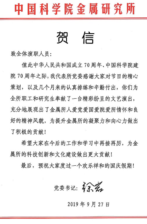 演出前,徐巖書記代表所黨委和所班子致辭。他指出,新中國成立以來,中國共產黨帶領全國各族人民取得了舉世矚目的偉大成就,在新中國70華誕即將到來之際,我們歡聚在這里,以文藝演出的方式表達金屬所人對中國共產黨的無限熱愛和對偉大祖國的美好祝福。他強調,金屬研究所作為一個有著66年歷史的老所、大所、強所,在老一輩科學家和幾代人的不懈努力下,現已建設成為材料科學與工程領域國內一流并具有重要國際影響的研究機構,是我國高性能材料研究與發展的重要基地,為國家科技進步、經濟社會發展和國家安全做出了一系列重要貢獻,祖國科技事業的進步和發展有我們不可替代的貢獻!徐巖書記激昂地說:走進新時代,歡歌頌盛世,祝愿偉大祖國更加繁榮昌盛、文明富強!