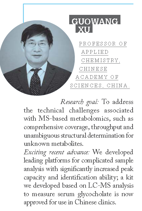 近五年來(lái),許國(guó)旺帶領(lǐng)團(tuán)隊(duì)在代謝組學(xué)等復(fù)雜體系分離分析研究方面取得了多項(xiàng)創(chuàng)新性研究成果:研發(fā)了適用于精準(zhǔn)醫(yī)學(xué)研究的超靈敏、高覆蓋的代謝組學(xué)定量、定性綜合技術(shù)體系,構(gòu)建了國(guó)際先進(jìn)的代謝組學(xué)分析平臺(tái);建立了一系列高靈敏、高覆蓋的新型多維色譜-質(zhì)譜分析方法;國(guó)際上首創(chuàng)擬靶向代謝組學(xué)新策略,實(shí)現(xiàn)了大規(guī)模臨床樣本代謝組高覆蓋精準(zhǔn)的分析;自主構(gòu)建的國(guó)內(nèi)最大的LC-MSn代謝組智能數(shù)據(jù)庫(kù),為代謝物規(guī)模化結(jié)構(gòu)鑒定和臨床標(biāo)志物發(fā)現(xiàn)提供了新工具。這些分析技術(shù)和方法已經(jīng)應(yīng)用于生命科學(xué)、醫(yī)學(xué)、食品安全等領(lǐng)域重大科學(xué)問(wèn)題的研究,為至少50個(gè)醫(yī)院提供代謝組學(xué)分析服務(wù),同時(shí)為國(guó)內(nèi)代謝組學(xué)學(xué)科發(fā)展作出貢獻(xiàn)。