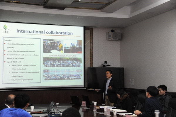 劉麗首先致歡迎辭,歡迎京都大學生態學研究中心2位專家來訪,并介紹了合作備忘錄的內容。隨后Shinichi Nakano主任介紹了京都大學生態學研究中心(CER, Kyoto University)概況,包括研究方向,野外臺站,實驗設備、人員組成等。方運霆從建所歷史,發展歷程,一三五規劃實施等方面向京都大學專家介紹了沈陽生態所情況。隨后朱教君與Shinichi Nakano分別代表研究所和京都大學生態學研究中心簽署了合作備忘錄,為雙方在科學研究、學生培養等方面的深入合作奠定了基礎。