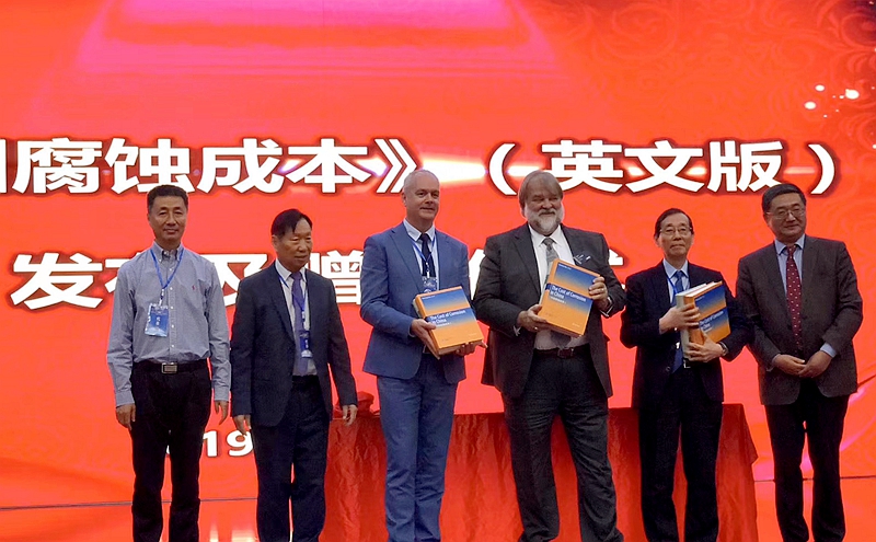 《中國腐蝕成本》英文版《The Cost of Corrosion in China》由國際出版巨頭Springer(斯普林格)出版集團與科學出版社共同出版,全球發行。本次腐蝕大會上,中國腐蝕與防護學會榮譽理事長侯保榮院士、理事長王福會教授、常務副理事長李曉剛教授和中國工程院環境與輕紡學部處長王小文女士共同為新書揭幕,并舉行了向NACE International主席Terry Greenfield、歐洲腐蝕聯盟主席Arjan Mol及日本腐蝕防護學會代表田邊弘往先生的贈書儀式,進一步加強了我國與全球腐蝕科技界的交流合作。