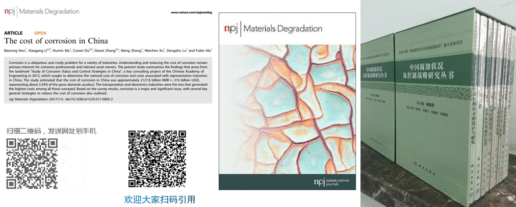 此外,關于中國腐蝕成本的研究成果和相關論文以“The cost of corrosion in China”為題發表在Nature子刊《npj Materials Degradation》(B. Hou, et al. 2017, 1, Article number 4). 同時,在本項目完成結題時,以徐匡迪院士、丁仲禮院士、周濟院士為顧問,侯保榮院士為總主編,出版腐蝕相關專著共計32部,并已由科學出版社正式出版發行。