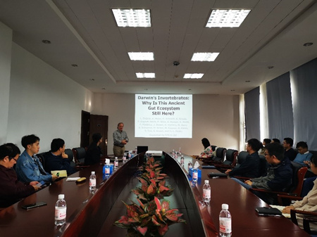 Drake首先做了題為“Darwin’s Invertebrates: Why Is This Primitive Gut Ecosystem Still Here?”的學術報告,詳細介紹了他40年以來對生物與環境相互作用關系的理解,重點介紹了蚯蚓腸道如何作為暫時的微生物生存綠洲,提供豐富的碳源;如何對不同種類的微生物進行選擇性的富集,改變土壤中微生物多樣性和結構的過程,并對整個過程中的反硝化作用、甲烷合成作用、發酵過程以及溫室氣體生成機理進行了詳細的闡述。隨后,Drake根據多年擔任AEM期刊主編的審稿經驗,做了題為“The Art of Scientific Publishing”的報告,特別指出科研工作者要具備應有的學術道德,耐心講述論文寫作中應該注意的問題,詳細指導如何將選擇題目、編寫摘要,如何將獲得的實驗數據和結果總結為精彩的論文并成功發表。
