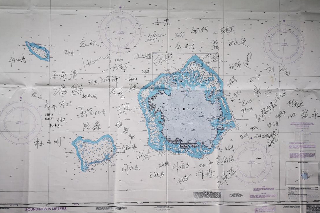 經過四十多天的并肩奮斗,來自不同單位的科考人員從陌生到熟悉,結下了深厚的友誼。部分科考隊員已經完成航次任務,將在靠港波納佩后返程回國。在“科學”號“海上堡壘”臨時黨支部書記杜玉剛同志提議下,全體船隊員在一張舊海圖上簽下自己的名字,把這段難忘的出海經歷及深厚友誼定格在海圖上。