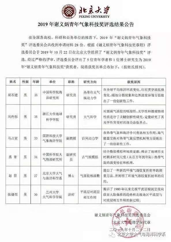北京大學組織的2019年謝義炳青年氣象科技獎日前正式揭曉。中國科學院海洋研究所胡石建研究員榮獲該獎項,以表彰其在熱帶印太氣候動力學方面取得的突出成績。本年度謝義炳青年氣象科技獎評選委員會共收到由全國各高校、科研院所和業務單位推薦的28份申請。評選委員會根據《謝義炳青年氣象科技獎章程》進行了嚴格的評審,評選出5位青年學者和1位博士研究生為2019年度謝義炳青年氣象科技獎獲獎者。這是海洋所研究人員首次獲得該獎項。