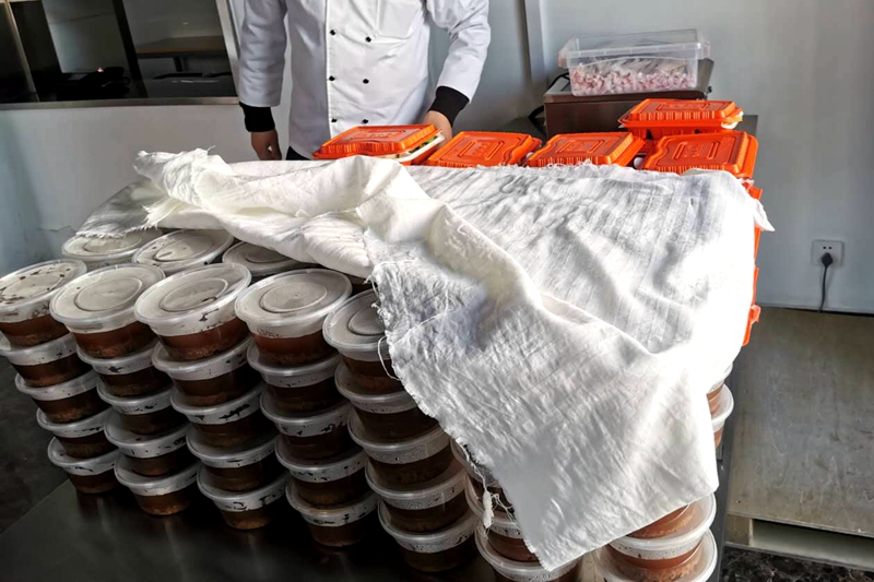 今天的供餐數量是160份,這對食堂工作人員也是一個不小的壓力。上午10點半,所有的菜品已準備完畢,開始進行套餐的盒飯分裝。今天的套餐A是“皮五花肉燉土豆-尖椒燒茄子-蒜蓉油菜-米飯-饅頭”,套餐B是“炸刀魚-青椒炒肉片-西紅柿炒雞蛋-米飯-饅頭”,包子是芹菜肉包,湯是八寶粥,看上去非常誘人。分裝好的盒飯整齊地擺放在食堂大廳,用專用的罩布進行保溫,靜靜等待開飯時間。