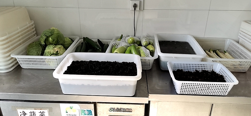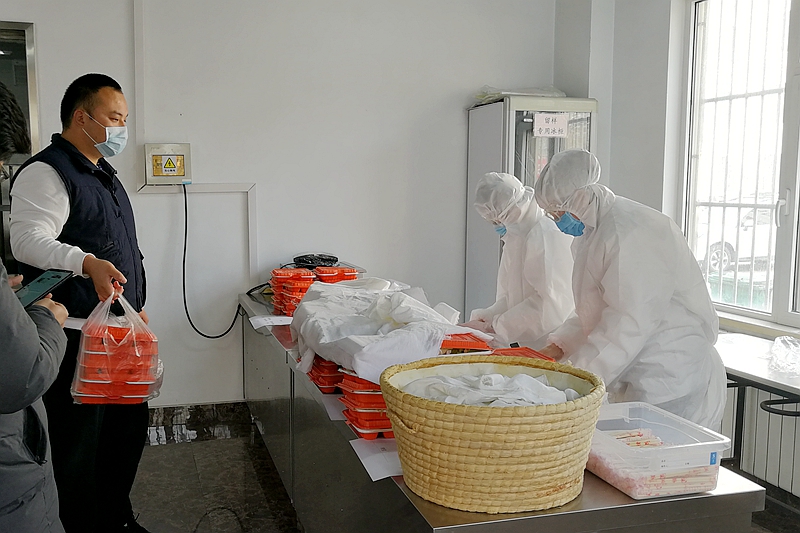 新鮮的肉蛋蔬菜等生鮮食材剛剛送到,幾位工作人員正在對外包裝進行清潔消毒,然后一一分類儲存好。疫情期間,本著“易存放的多量儲備,不易存放少量儲備,減少與供貨商直接接觸”的原則,食品采購方面非常謹慎。
