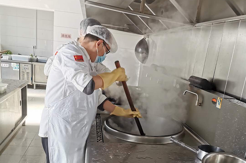 早上7點,海洋所辦公樓還是一片靜謐,在食堂后廚,負責人王保新已經帶領工作人員開始了一天的忙碌。在這場沒有硝煙的防疫戰斗中,食堂作為保障職工食品安全的重要部門,做好疫情防控是重中之重。