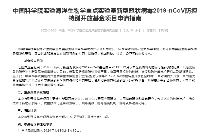 海洋所在加強疫情防控工作的同時,通過多種措施積極開展科研工作,出臺《海洋所疫情防控期間開展科研工作的若干意見》,努力做到防疫工作與科學研究兩不誤。通過分析疫情需求和研究所科研優勢及資源平臺條件,海洋所支持實驗海洋生物學重點實驗室籌集100萬元設立“新型冠狀病毒2019-nCoV防控特別開放基金項目”,鼓勵科研人員以新冠病毒肺炎防控為首要目標開展協同科研攻關,力爭為新型冠狀病毒防控提供技術支撐和理論指導,目前該開放基金項目正在申請受理中。