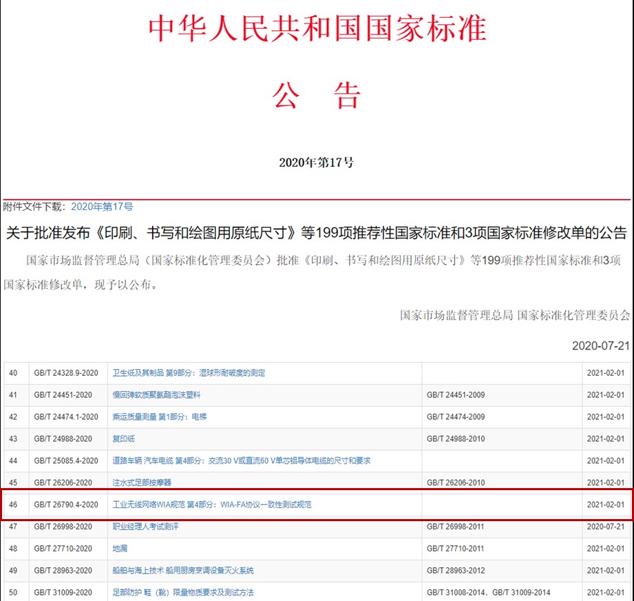 工業無線網絡WIA系列國家標準,依據具有自主知識產權的WIA技術體系形成,包括“工業無線網絡WIA規范 第1部分:用于過程自動化的WIA系統結構與通信規范”(GB/T 26790.1-2011)、“工業無線網絡WIA規范 第2部分:用于工廠自動化的WIA系統結構與通信規范”(GB/T 26790.2-2015)、“工業無線網絡WIA規范 第3部分:WIA-PA協議一致性測試規范”(GB/T 26790.3-2015)以及最新發布的“工業無線網絡WIA規范 第4部分:WIA-FA協議一致性測試規范”(GB/T 26790.4-2020)。
