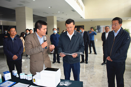 楊軍一行聽取了微生物制造工程中心呂雪峰研究員有關螺旋藻生產甘油葡糖苷技術和微生物發酵制備反式烏頭酸技術的產業化應用成果、單細胞中心徐健研究員有關團隊研發的國際上首臺高通量流式拉曼分選儀及掌上型新冠病毒快檢儀的匯報,深入了解了科研產品與實驗裝置。