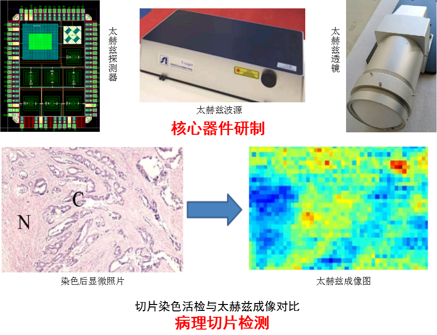 在項目負責人祁峰研究員的帶領下,針對太赫茲癌癥檢測成像分辨率不足的技術瓶頸和國產太赫茲核心器件缺乏等問題,科研人員從波動性出發提出并實現了超分辨成像方法,自主開發了包括波源、透鏡以及探測器等核心器件并實現了國產化。其中波源和透鏡主要性能指標超國外同類進口產品,大幅提高了太赫茲成像系統性能。