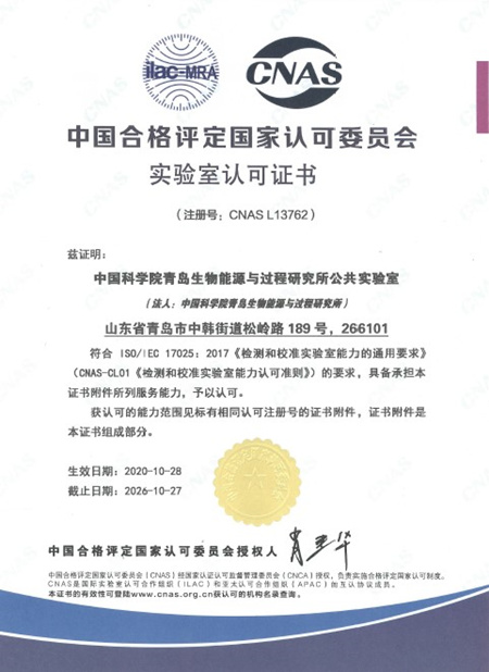 近日,青島能源所公共實驗室成功獲得了由中國合格評定國家認可委員會(CNAS)頒發的實驗室認可證書(注冊號 CNAS L13762)。這標志著公共實驗室具有了符合ISO/IEC 17025:2017《檢測和校準實驗室能力的通用要求》和CNAS-CL01《檢測和校準實驗室能力認可準則》要求,并經過CNAS認可的技術服務能力。