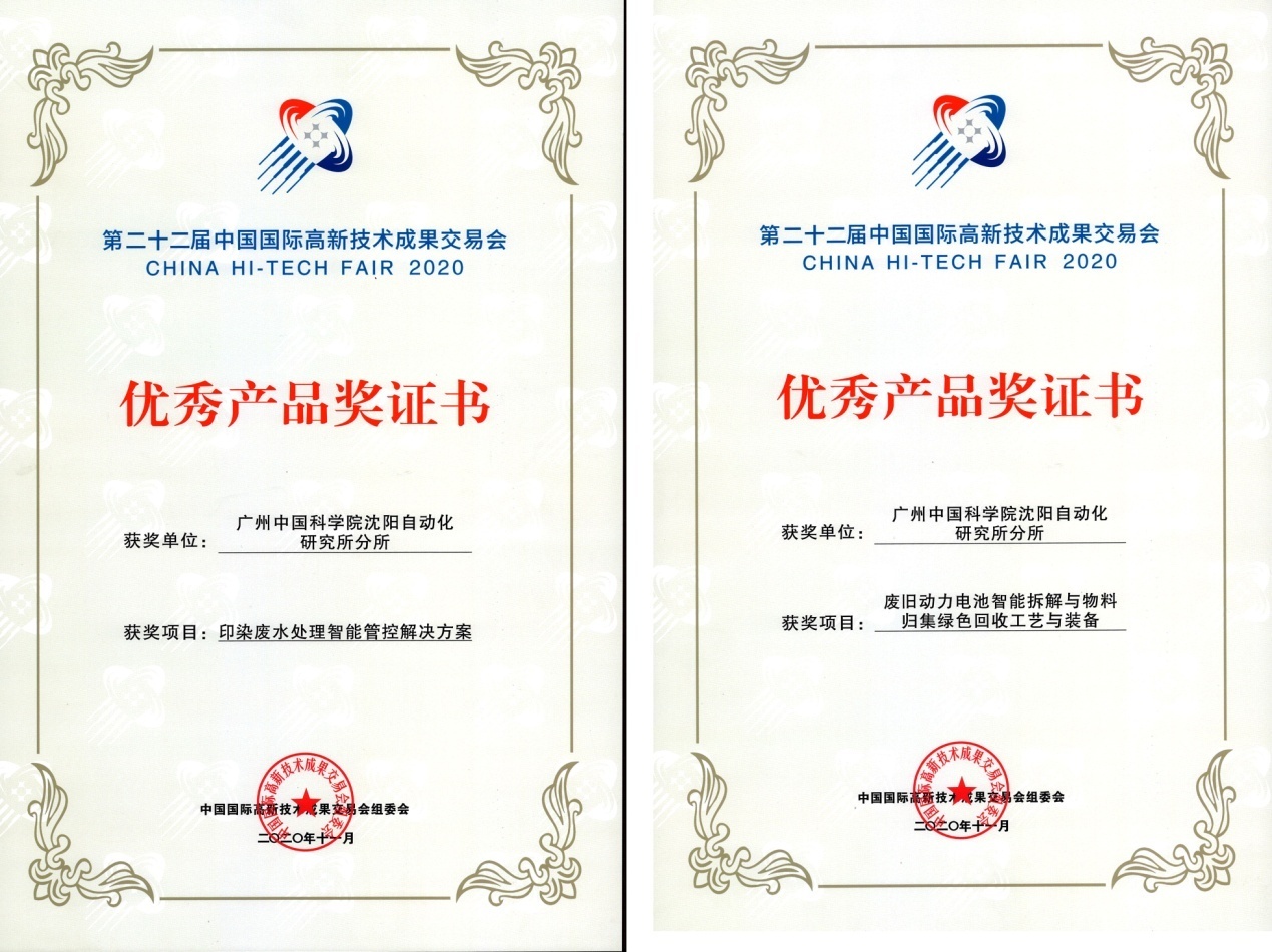 11月11日至15日,廣州中國(guó)科學(xué)院沈陽(yáng)自動(dòng)化研究所分所(以下簡(jiǎn)稱“廣州分所”)攜“印染廢水處理智能管控解決方案”“廢舊動(dòng)力電池智能拆解與物料歸集綠色回收工藝與裝備”亮相第二十二屆中國(guó)國(guó)際高新技術(shù)成果交易會(huì)(以下簡(jiǎn)稱“高交會(huì)”),受到了與會(huì)領(lǐng)導(dǎo)、來(lái)賓及媒體的廣泛關(guān)注,兩項(xiàng)參展成果均榮獲高交會(huì)優(yōu)秀產(chǎn)品獎(jiǎng)。