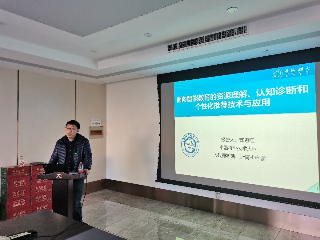 報告會上,陳恩紅以《面向個性化學習的認知建模、教學資源分析及推薦》為題作報告。圍繞大數據分析及應用實驗室在在線教育系統方面的研究工作,首先介紹了研究背景與現狀,重點介紹了面向個性化學習的認知建模、資源分析及推薦方法與應用,著力解決學習資源表征困難、學習過程建模復雜以及學習策路難量化等問題,以從海量、稀疏、高噪聲的學習數據中準確分析學生的學業水平特點。陳恩紅和參會人員進行了深入的討論。報告會內容豐富,思想深刻,與會師生表示受益匪淺。