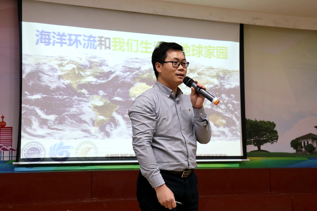 胡石建研究員為全體師生作了題為“海洋環流和我們生活的家園”的海洋科普報告。胡石建研究員從直觀熟知的小問題入手,如地球是什么顏色、地球與月球有什么不同等引出海洋的重要性,通過生動的圖片和動畫帶領學生們搭上海洋環流知識的奇妙旅程。孩子們乘著“海洋環流”過山車從南極漂到北極,從非洲漂到南美洲,穿過叢林、越過山脈,領略了海洋環流的重要性和神奇魅力。胡石建研究員通俗易懂地介紹了從古至今人類對海洋環流的測量方法和現代化的觀測技術,把嚴肅深奧的科學研究轉化成生動有趣的演繹。學生們提出了很多有趣的問題,胡石建研究員與現場100多位小學生進行了熱烈的交流討論。