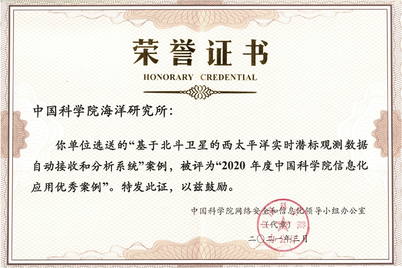 近日,中國科學院公布了“2020年度中國科學院信息化十大優秀案例”,海洋所王凡團隊自主建設完成的“基于北斗衛星的西太平洋實時潛標觀測數據自動接收和分析系統”成功入選。