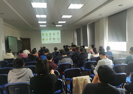 在安全培訓中,董佳結合現場檢查情況,從危化品管理、危險實驗管理、設備管理、個人防護、國家安全、交通安全等方面,通過安全管理知識講解、事故圖片展示、以及近兩年部分有代表性的安全事故案例分析,介紹了安全管理經驗,強調了日常注意事項。培訓過程中,參會人員還就實驗室日常安全管理工作進行了交流討論。