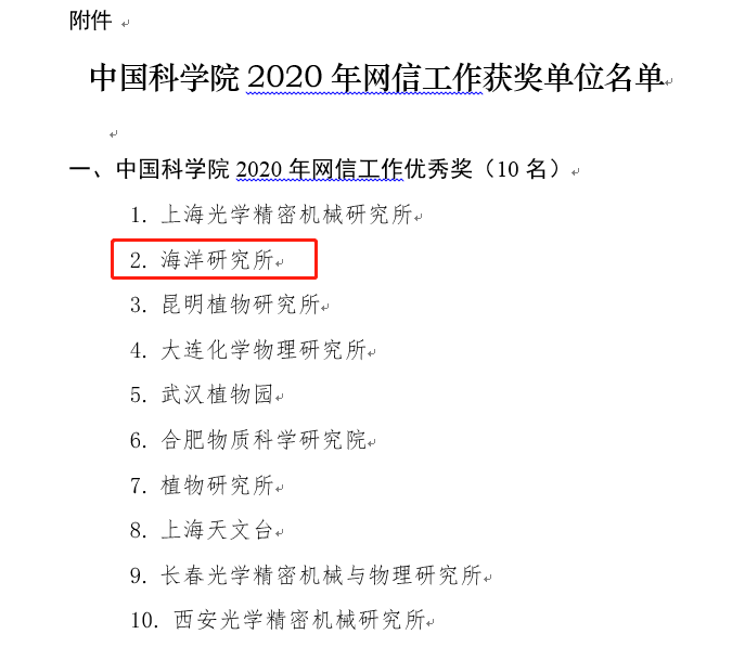 近日,中科院辦公廳發布2020年中國科學院信息化評估結果,海洋研究所位列第2名,榮獲網信工作優秀獎。