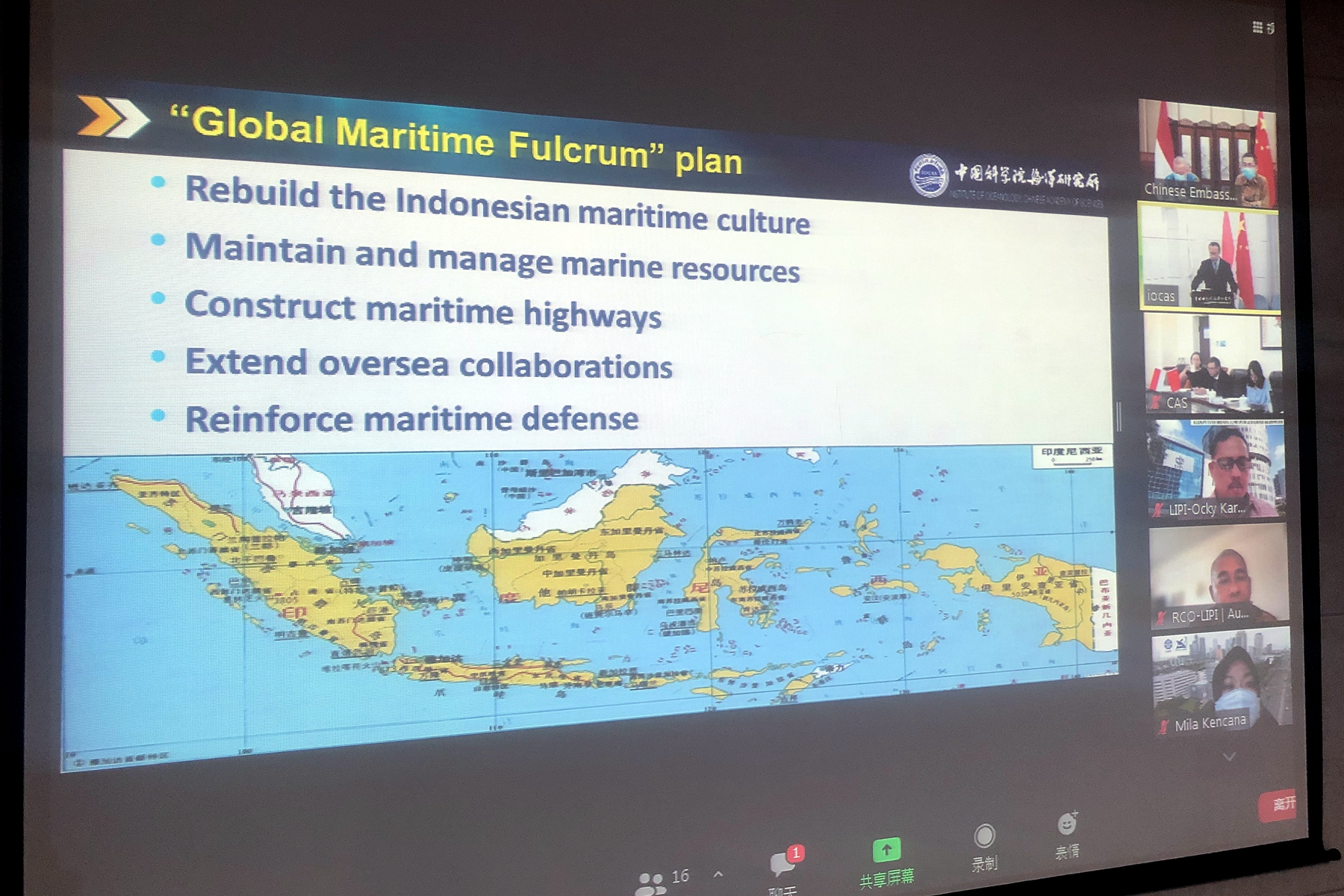 中國駐印尼使館科技參贊易凡平、印尼科學院副院長Ocky Karna Radjasa及中科院國際合作局副局長王振宇出席會議并見證《意向書》簽署。中國駐印尼使館、中科院國際合作局、印尼科學院合作、法律及公共關系局、中科院海洋所及印尼科學院海洋研究中心相關人員參加了會議。