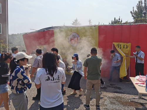 演練則設置了模擬火災逃生屋,布置場景、散布煙霧,模擬出逼真的火災現場。在沒有照明、濃煙密布的情況下,參加演練人員濕毛巾捂住口鼻、低下身體,按照安全逃生要領“逃”出火災現場,體驗火災發生后如何在狹小黑暗的空間里疏散逃生和實施自救。