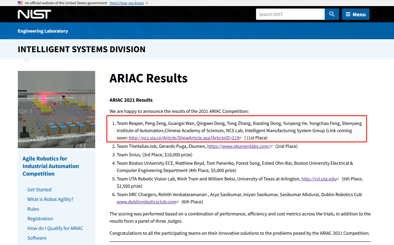 7月15日,由美國國家標準與技術研究院(NIST)舉辦的2021年度ARIAC(Agile Robotics for Industrial Automation Competition)面向工業自動化的敏捷機器人集群國際挑戰賽發布了比賽結果,經過初賽、決賽二輪激烈角逐,中國科學院沈陽自動化研究所工業控制網絡與系統研究室邊緣計算與邊緣智能課題組萬廣喜、董青衛、張通、董曉婷、賀云鵬、馮勇超組成的Reaper團隊,在參賽的60余支代表隊中脫穎而出,榮獲冠軍。 Ekumen實驗室的TIJob團隊、Denbar Robotics機器人研究中心Sirius團隊、波士頓大學ECE團隊、德克薩斯大學UTA Robotic Vision Lab團隊和Dublin機器人俱樂部DRC Chargers團隊分獲2-6名。