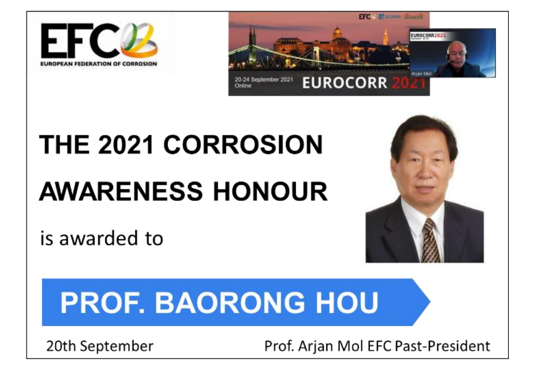 世界“腐蝕成就獎”于2021年首次設立,由世界腐蝕組織發起,與歐洲腐蝕聯盟及中國腐蝕與防護學會聯合舉辦,旨在授予具有重大影響力,顯著提高了政府、科技界、工業界和公眾對腐蝕及防腐重要性的認知,并在腐蝕控制領域做出杰出貢獻的科學家。該獎項由世界腐蝕組織、歐洲腐蝕聯盟及中國腐蝕與防護學會的委員等組成的國際評審委員會評議,不接受個人申報。經多輪投票和評議,一致推選侯保榮院士為2021年度世界“腐蝕成就獎”唯一獲獎者。