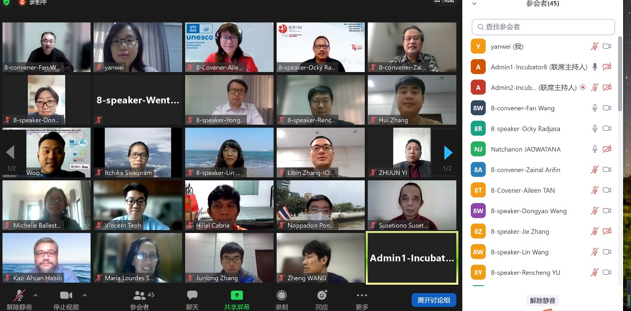 科技部21世紀議程管理中心副處長王文濤和中科院國際組織處副處長王東瑤分別為“印太交匯區”分會場作開幕式致辭,鼓勵各國海洋界人士積極參與由中科院海洋所主導的“印太交匯區多學科綜合調查-生物多樣性研究”國際大科學計劃。分會包括4個特邀報告、3個短報告和會議討論三部分。特邀報告部分,中科院海洋所所長王凡介紹了氣候變化對印太交匯區海洋生物多樣性的影響;印尼國家研究與創新機構(BRIN) 地球科學研究所所長Ocky Karna Radjasa從生態生物技術的視角介紹了海洋生物多樣性的意義與應用前景;馬來西亞大學海洋與海岸研究中心所長Aileen Tan介紹了提高公眾認知和意識對生物多樣性保護的重要性;中科院海洋所研究員于仁成介紹了印太交匯區國際大科學項目I3PCC-MEB 的設計和行動方案。短報告部分主要由青年學者主導,來自斯里蘭卡西北大學的Krishan D. Karunarathne博士介紹了海洋生物多樣性對產業的支撐作用,來自中科院海洋所的張杰博士和袁涌銓博士分別介紹了馬尾藻的養殖應用案例與應用改性粘土治理中國和東盟國家有害藻華的實踐案例。會議討論過程中,參會者表達了對印太交匯區項目的興趣和期待能開展合作的愿望。通過成功主辦此次聯合國十年行動孵化器的“印太交匯區”分會場,海洋所向國際海洋界,尤其是亞太區域各國的海洋界人士宣傳了“印太交匯區多學科綜合調查-生物多樣性研究”國際大科學項目的主旨與研究目標,并希望能邀請來自各個國家、海洋各界的專家與青年工作者共同設計和發展“印太交匯區”項目,為聯合國“海洋十年”作出積極貢獻,發展“健康的海洋”。