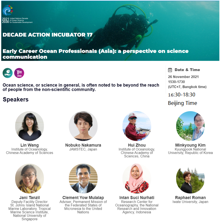 為期兩天的會議包括聯合國機構、政府、企業和私營部門以及其他利益相關者團體的高級別承諾會議和一系列題為聯合國“十年行動孵化器”(Decade Action Incubator)的線上分會。中國科學院海洋研究所周慧博士和王琳博士參加了聯合國“海洋十年青年海洋學者亞洲區域工作組 (ECOP Asia)”主持的分會。該分會主旨是促進聯合國“海洋十年”青年海洋學者的發展并加強ECOP在海洋科學知識傳播中的作用,吸引了來自中國、韓國、日本、澳大利亞、新加坡、菲律賓、印度尼西亞等十余個國家的青年海洋學者及海洋科普工作者參會。