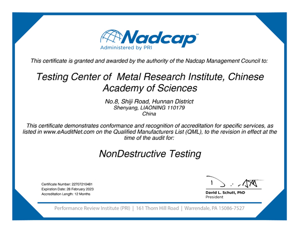 金屬所分析測試中心已于2021年7月正式獲得Nadcap-MTL(材料測試實驗室)認證,并于2021年10月進行了Nadcap-NDT(無損檢測)現場審核,于11月正式獲頒證書。