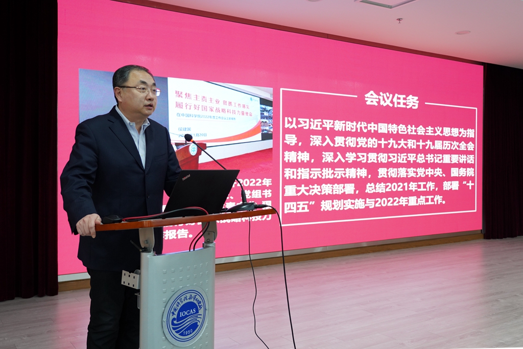 所長王凡作專題報告,從“習近平總書記和中央領導同志對我院重要指示批示” “一年來科技創新和改革發展取得成效” “新形勢下面臨任務與總體要求” “2022年主要工作思路”四個方面,詳細傳達學習了侯建國院長在中科院2022年度工作會議上的報告精神,并結合國際國內形勢以及海洋領域發展態勢,深入剖析了研究所創新發展面臨的問題和挑戰。