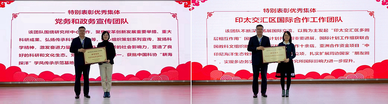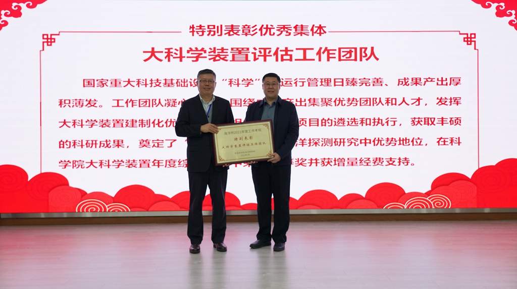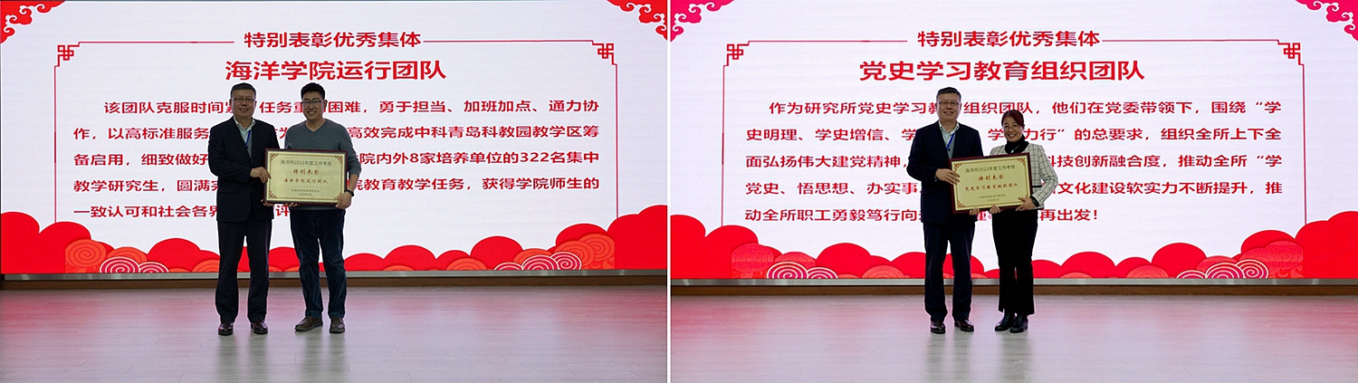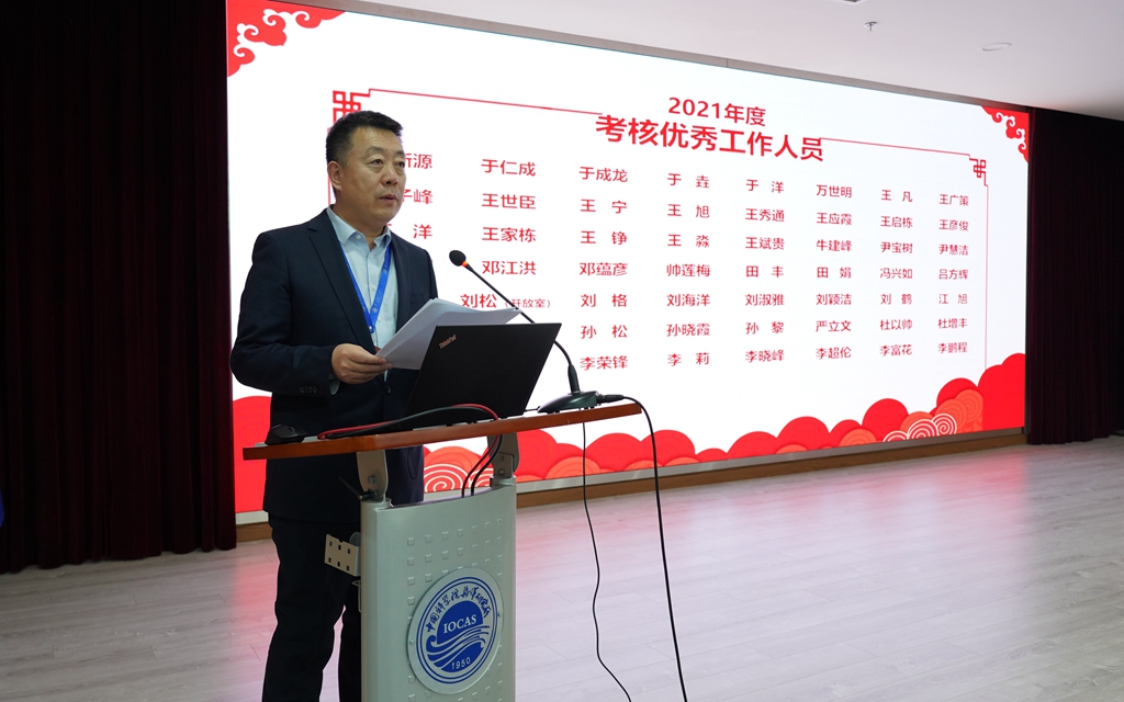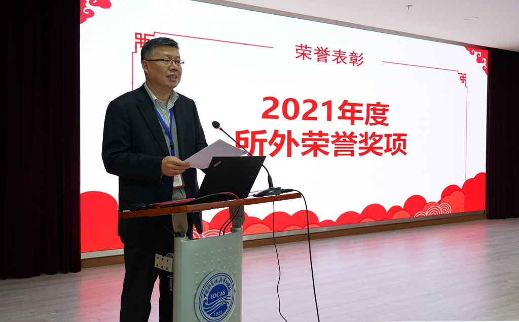 會議宣讀了研究所2021年度成果、獲得所外各類榮譽獎項以及年度考核優秀研究組、優秀集體和個人的通知,對獲獎集體和個人進行了表彰,并公布了海洋所2021年度十件大事評選結果。