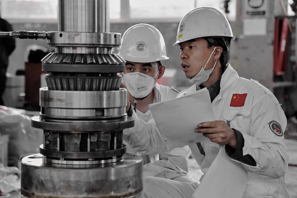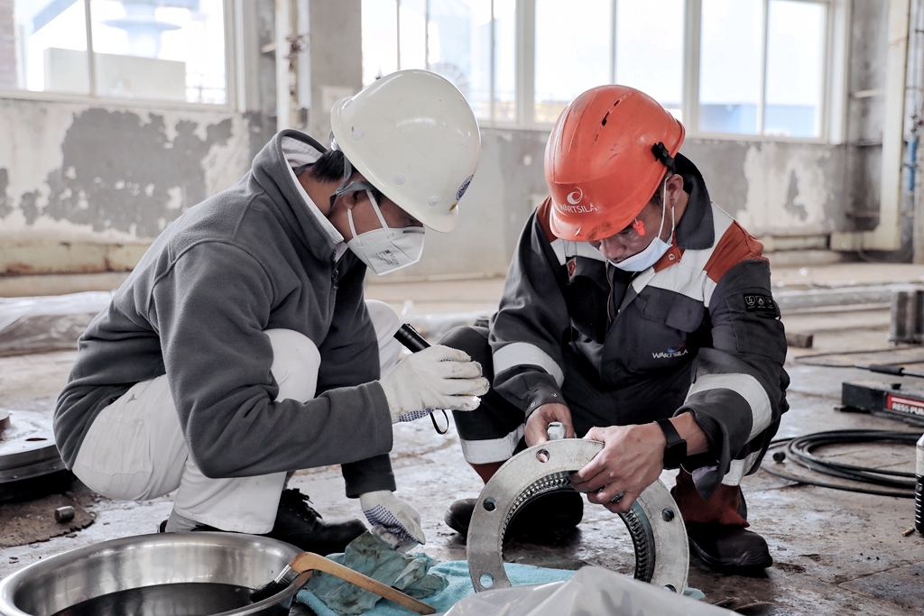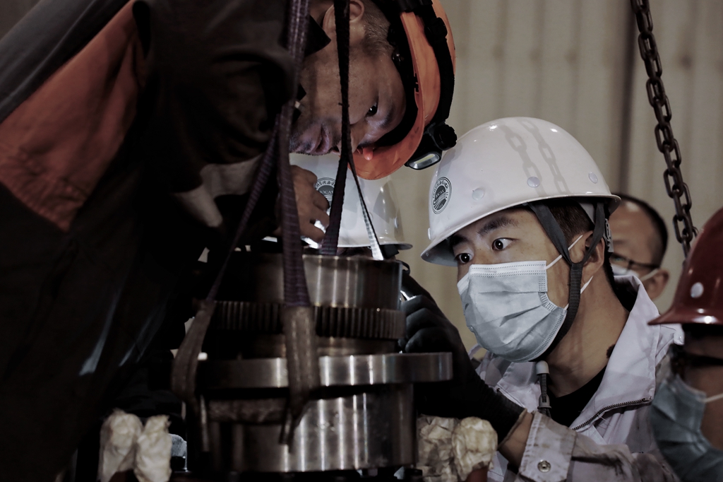 工作人員加班加點對瓦西蘭首側推裝置進行拆解維護
