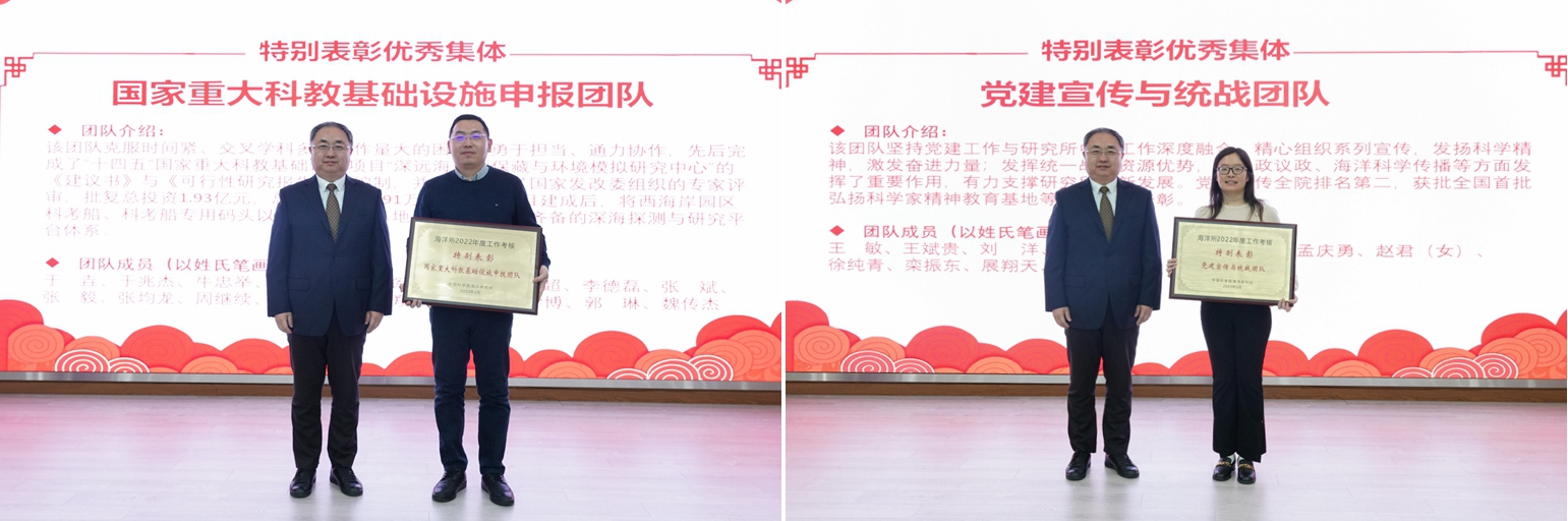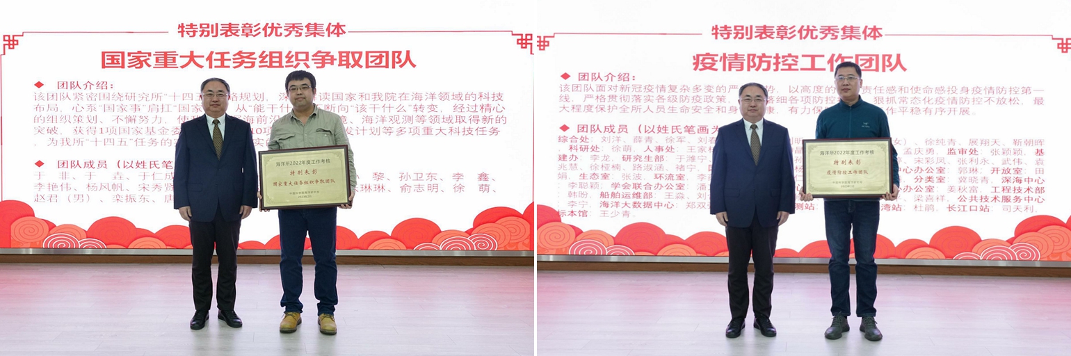 會上宣讀了研究所2022年度重大成果、獲得所外各類榮譽獎項以及年度考核優秀集體和個人的通知,對獲獎集體和個人進行了表彰,并公布了海洋所2022年度十件大事評選結果。