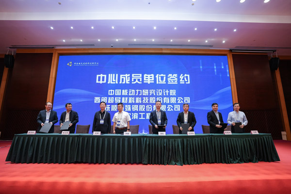 開幕式后,金屬所副所長劉崗介紹了研究所基本情況,舉行了中心新成員簽約儀式,中國核動力設計研究院、西部超導材料科技股份有限公司、撫順特殊鋼股份有限公司、哈爾濱工程大學、新疆湘潤新材料科技有限公司、中核四0四有限公司、南京理工大學等12家單位簽約加盟師昌緒先進材料創新中心。