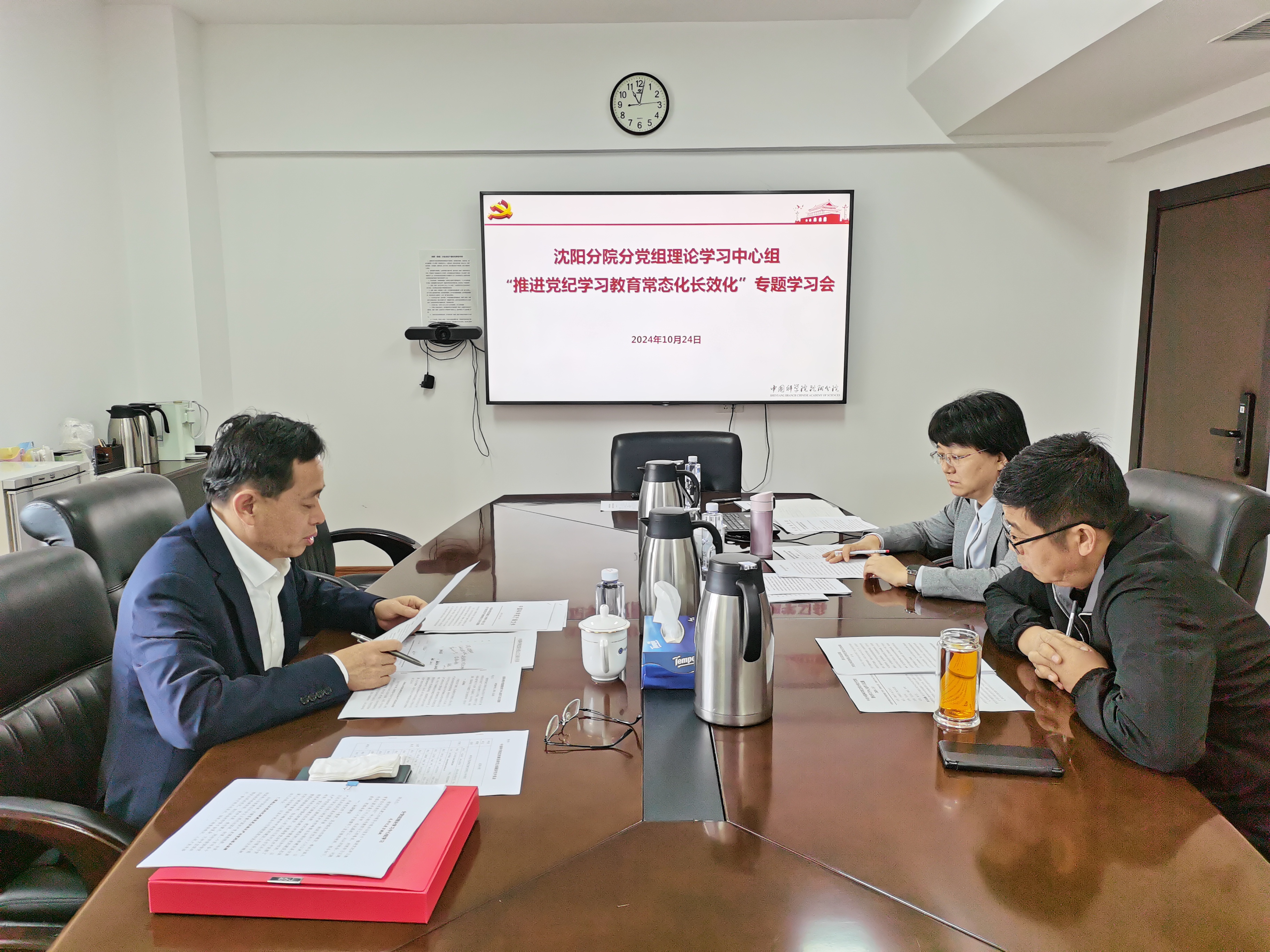 按照院黨的建設工作領導小組辦公室要求,10月24日,沈陽分院分黨組理論學習中心組召開“推進黨紀學習教育常態化長效化”專題學習會,分黨組書記、院長毛志遠,分黨組副書記楊宏,紀檢組組長、分黨組成員李明參加會議。